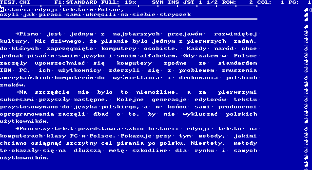 Powyższy artykuł został napisany za pomocą edytora ChiWriter w wersji 3.11, dostosowanej do obsługi polskich znaków. Ponieważ format zapisu plików tego edytora jest prosty i przejrzysty (być może napiszę o tym kiedyś osobny tekst), napisanie programu odczytującego pliki *.CHI i przekształcającego je na dowolną nowoczesną postać było kwestią dwóch dni pracy. Choć oczywiście nie mam zamiaru nikomu polecać korzystania z tak archaicznego narzędzia, pokazuje to, że trzydziestoletni już program wciąż może służyć do pożytecznej, kreatywnej pracy. Zawsze najbardziej się bowiem liczy nie to, czym się pracuje, lecz jaki jest efekt tej pracy.
