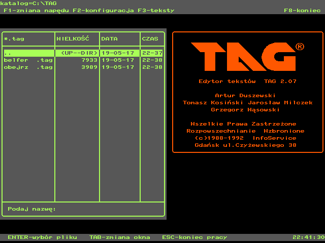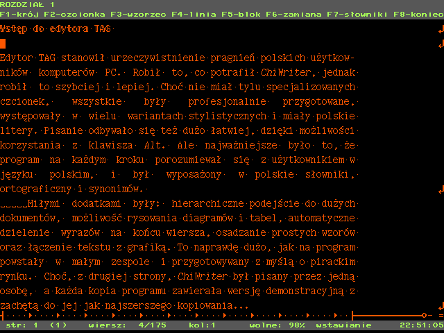 Polacy nie gęsi i swój język mają. A skoro ten język sprawiał komputerom tyle problemów, postanowili mieć również własny edytor tekstu, który radziłby sobie z nim dużo lepiej, niż na siłę wtłoczony w polskie realia ChiWriter. Tak powstał edytor TAG, napisany w gdańskiej spółdzielni InfoService.